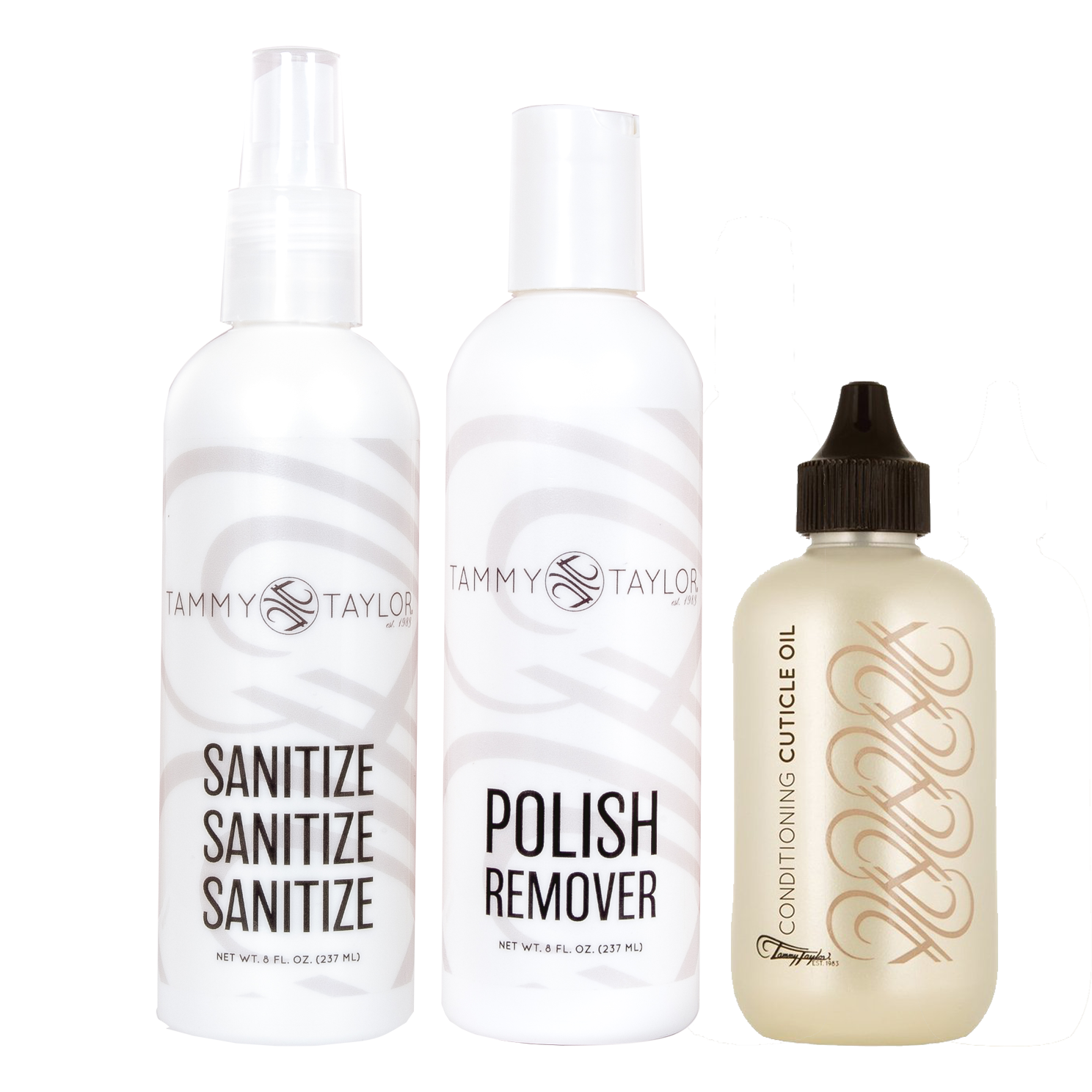 This bundle includes an 8oz bottle of Sanitize, 8oz bottle of Polish Remover, & 4oz bottle of Cuticle Oil.