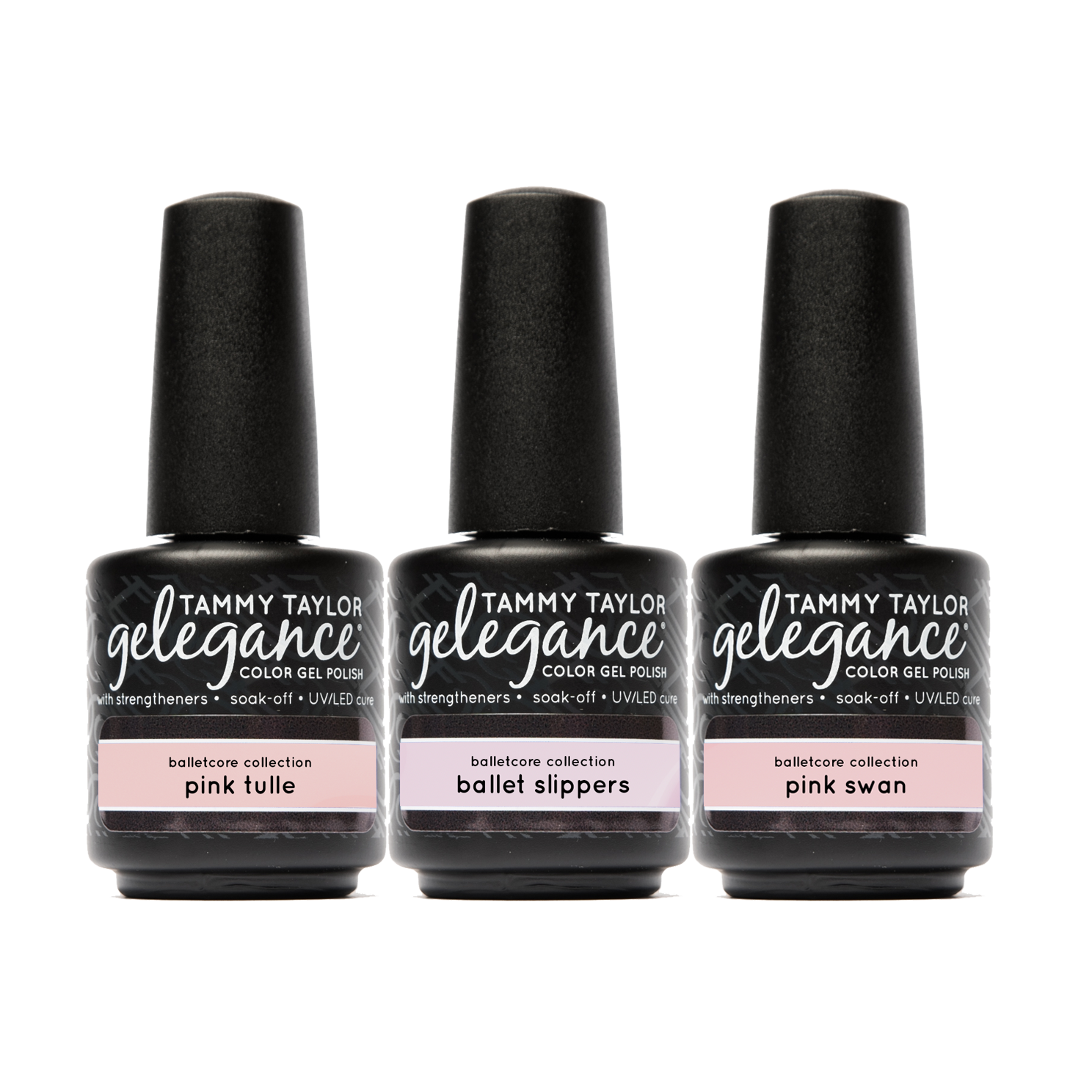 This Bundle includes 3 Gelegance Gel Polishes, 3 Soulmate Nail Lacquer's & 2 Art Gels: Pink Tulle is a warm pink french. Ballet Slipper is a natural pink french. Pink Swan is a cool pink french. On Pointe is a light