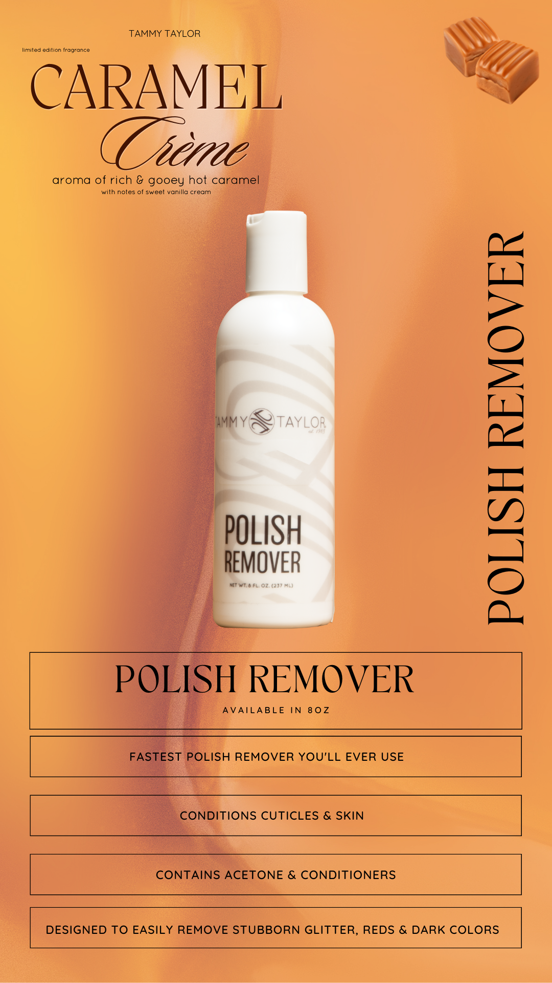 BRAND NEW fragrance is now available! Caramel Crème aroma of rich & gooey hot caramel with notes of sweet vanilla cream. DETAILS: Fastest Polish Remover you'll ever use! Available in 8oz bottle. DETAILS: Works as fas