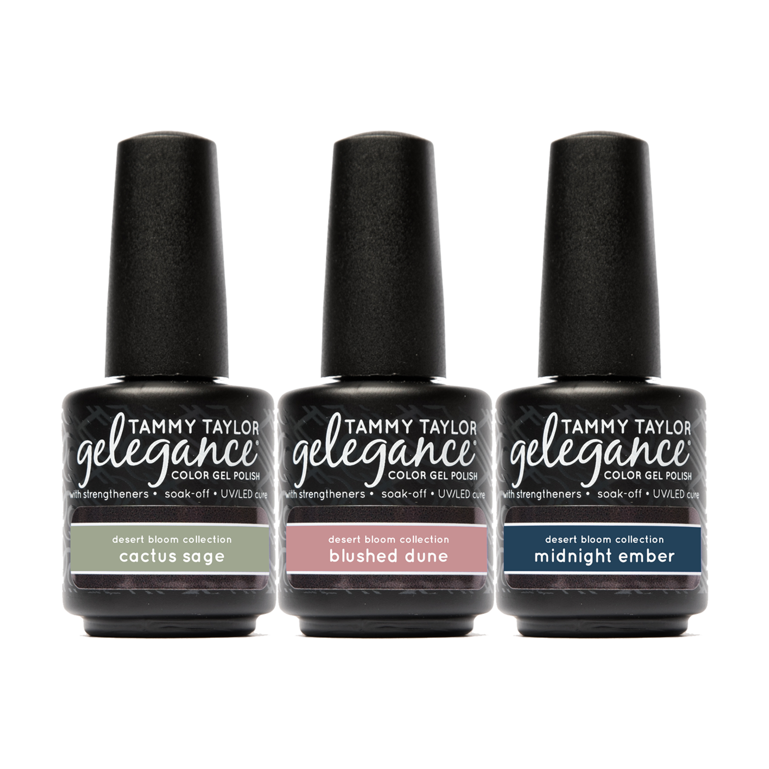 This Bundle includes 3 Gelegance Gel Polishes & 3 Soulmate Nail Lacquer's: Cactus Sage is a slate green. Blushed Dune is a heather mauve. Midnight Ember is a smoky navy blue. Gel Polish DETAILS: • Doesn’t Shrink • Do