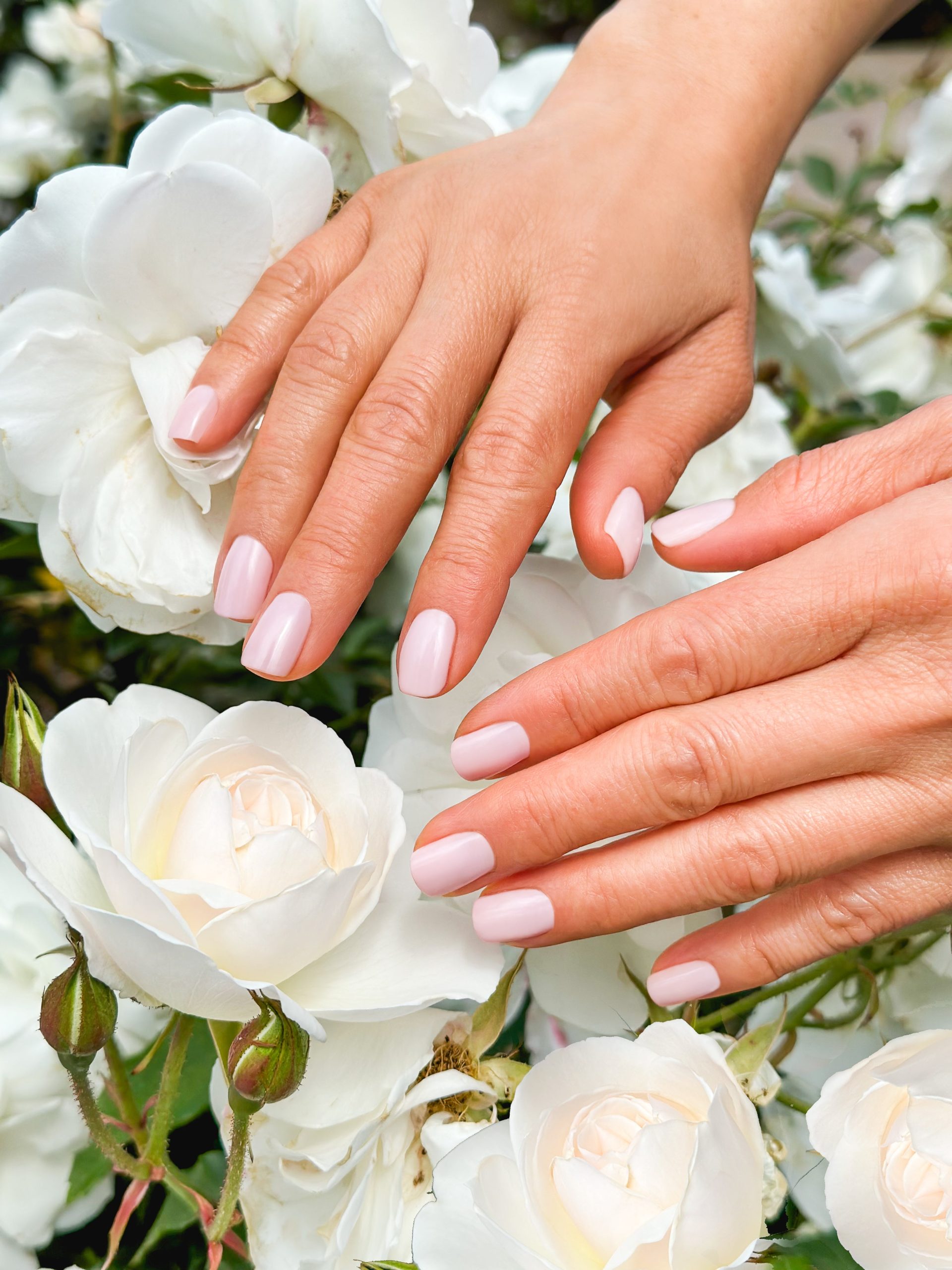 A cool French pink with full coverage.