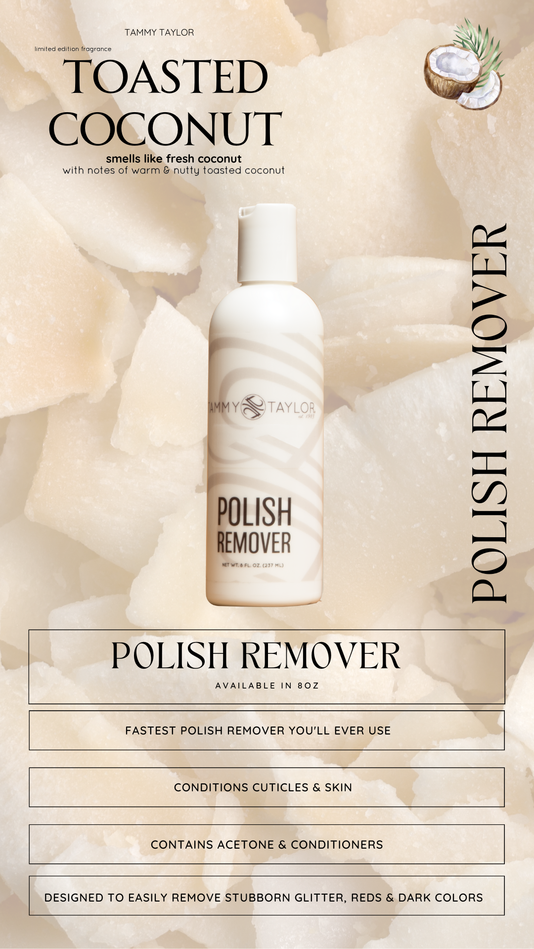 BRAND NEW fragrance is now available! Toasted Coconut smells like fresh coconut with notes of warm & nutty toasted coconut. This bundle includes an 3.3oz Glass Spray Sanitize, 8oz bottle of Polish Remover, & 4oz
